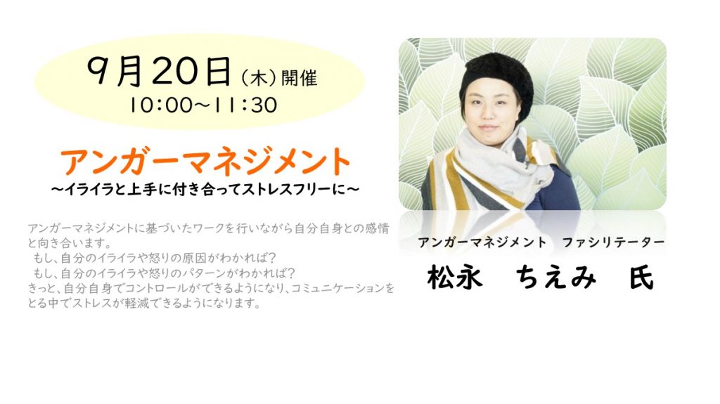 産後の仕事復帰のためのプログラム 9月から2クールがスタートします。 2クール目の第1回目は 「アンガーマネジメント~イライラと上手に付き合ってストレスフリーに~」 =内容= 子ども、家族、上司、同僚・・・ … 続きを読む 鳥取 9月20日(木)アンガーマネジメント~イライラと上手に付き合ってストレスフリーに~ 【産後の仕事復帰のためのプログラム】