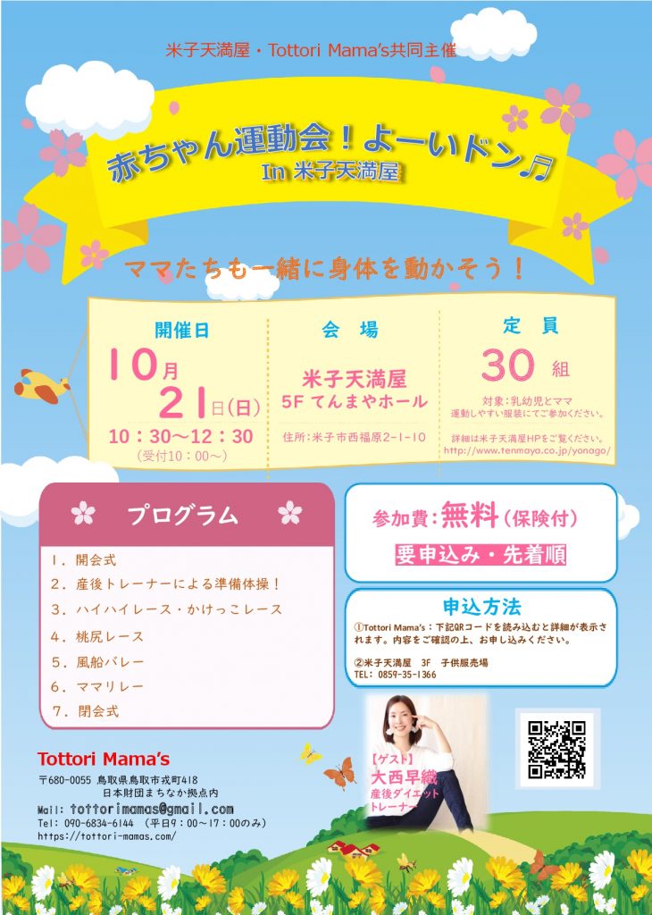 毎年、鳥取市で開催している【赤ちゃん運動会!よーいドン♬】を 今年は米子市で初開催です! 赤ちゃんたちの可愛い競技といえば 定番のハイハイレース! よちよち歩けるようになったお子さまは かけっ … 続きを読む 【米子】10月21日(日)開催【赤ちゃん運動会!よーいドン♪ in 米子天満屋】