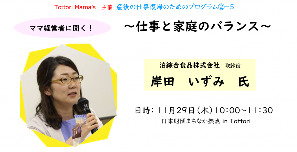 11月29日開催 ~産後の仕事復帰のためのプログラム~ 「ママ経営者に聞く!仕事と家庭のバランス」 現在、4歳の現役ママ。かつ会社を経営する女性。 多忙な中で、どのように家庭と仕事とのバラン … 続きを読む 鳥取 11月29日開催「ママ経営者に聞く!仕事と家庭のバランス」 ~産後の仕事復帰のためのプログラム~