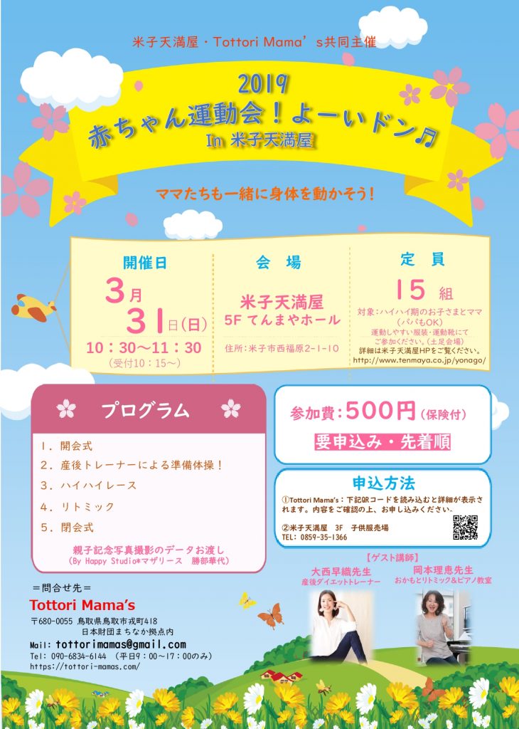 今年も赤ちゃん運動会を開催します! 生まれてから1歳になるまでの 子どもの成長スピードはすさまじく速いですよね! ハイハイ期と運動会の時期が合わないですー涙 とママからのお声を たくさんいただき 春と秋の年 … 続きを読む 米子 3月31日(日)開催【赤ちゃん運動会!よーいドン♪ in 米子天満屋】