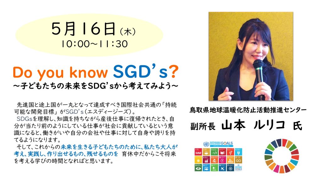 5月16日(木)開催 ~産後仕事復帰プログラム~ 「子どもたちの未来と私たちの暮らしをSDGsから考えてみよう」 この頃、メディア等でよく聞くようになった「SDGs(エスディージーズ)」とい … 続きを読む 鳥取 5月16日(木)「子どもたちの未来と私たちの暮らしをSDGsから考えてみよう」 ~産後仕事復帰プログラム2019~