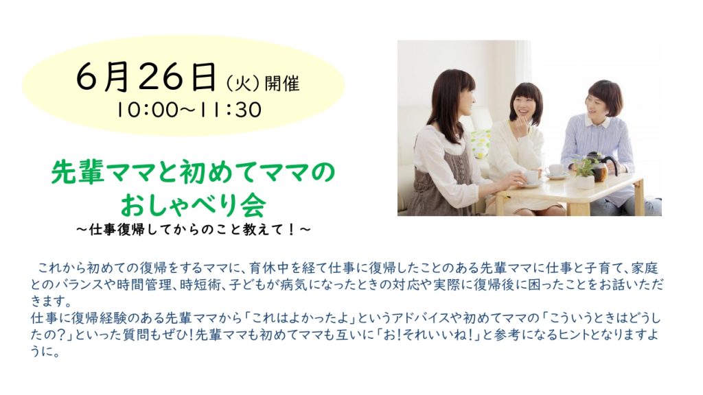 6月26日(水)開催 ~産後仕事復帰プログラム~ 「先輩ママと初めてママのおしゃべり会」 これから初めての復帰をするママに、 育休中を経て仕事に復帰したことのある先輩ママに 仕事と子育て 家 … 続きを読む 鳥取 6月26日(水)仕事復帰の先輩ママと初めてママのおしゃべり会 ~産後仕事復帰プログラム2019~