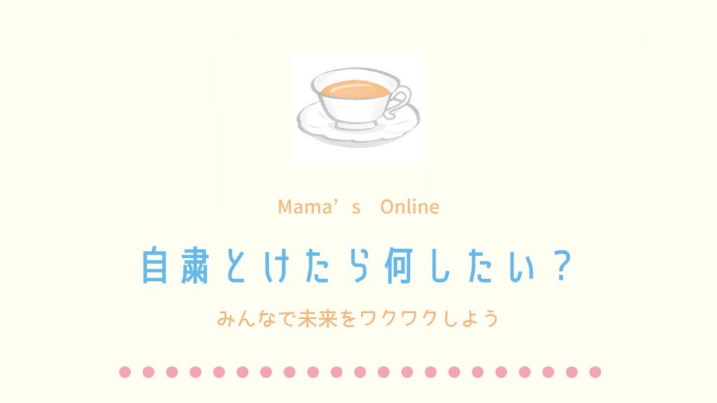 新型コロナウイルス感染拡大を防止するために外出自粛となって 行きたいところに行けない―! やりたいのにできないー! と我慢をしている方も多いと思います。 みんなが一緒になって気持ちをひとつに … 続きを読む Mama’s Online ママのおしゃべりカフェ ~自粛とけたら何したい?~