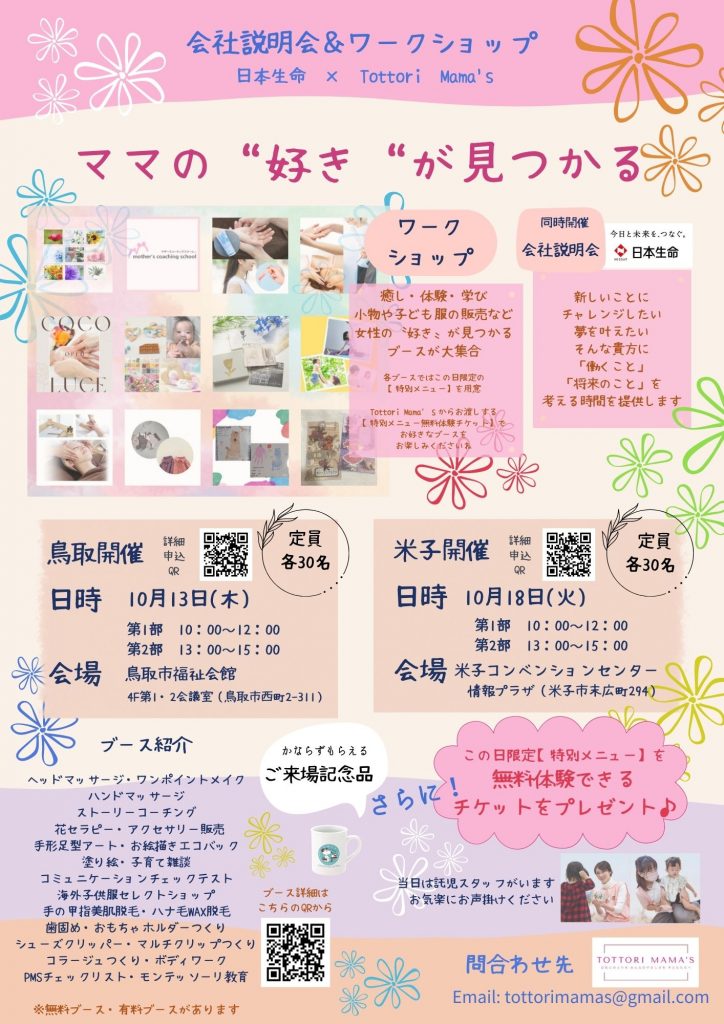 10月18日(火)米子市開催) 「ママの〝好き〟が見つかる」イベントにて出店するブースの紹介です☆ 【この日限定の特別メニュー】が用意され Tottori Mama’sからお渡しする【特別メニュー無料体験チ … 続きを読む 10月18日(火)米子開催イベント ブース紹介